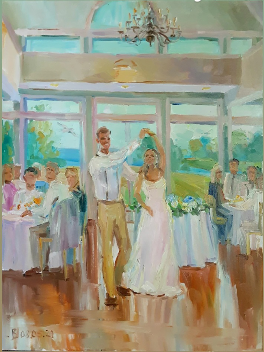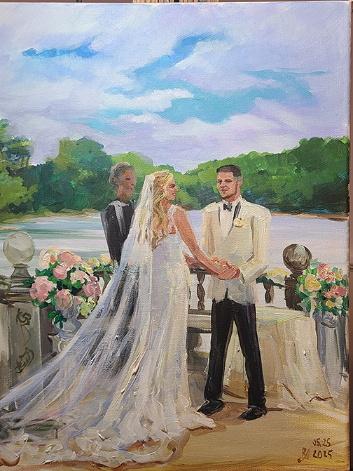 Sometimes, the bride and groom request a painting with minimal detail—just an impression, with no recognizable faces. Even then, Vesna ensures that the bride and groom still resemble themselves, but with fewer details involved. WIth this option comes $200- $300 discount, and it depends on the size of the painting.
