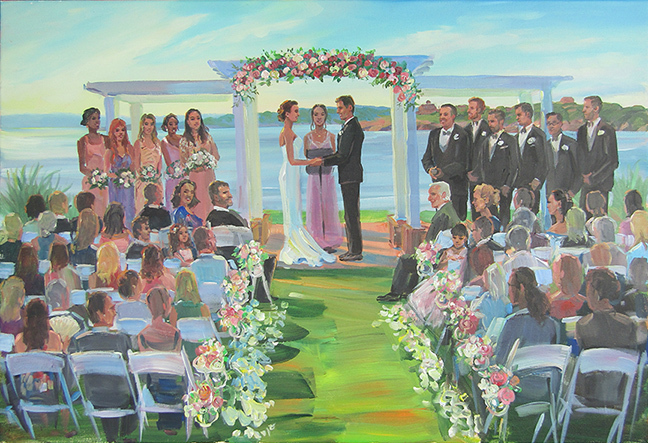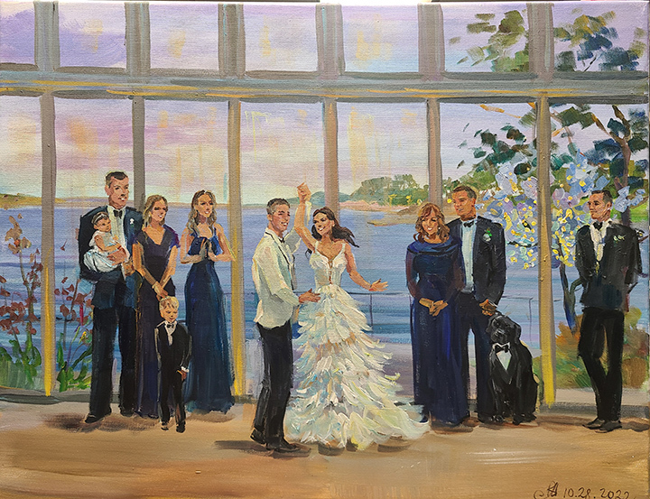 This format works well for both ceremony and reception paintings.Allows more details, more interior, more faces. It is particularly popular for ceremony paintings, as it provides space to include the bridal party, parents, and, of course, the center of attention — the bride and groom.
