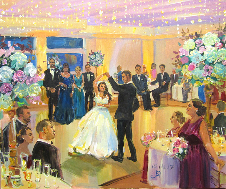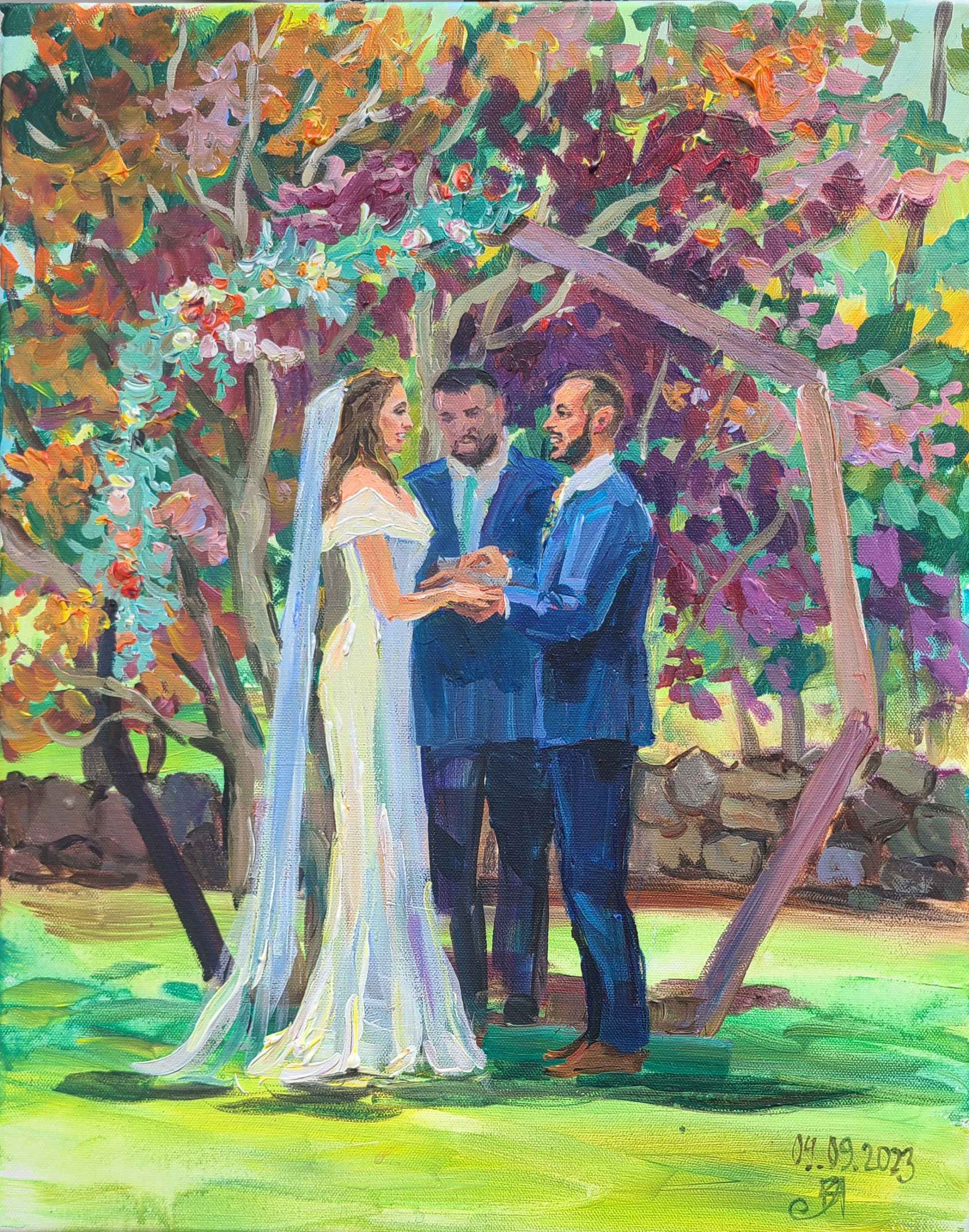 This format works well for both ceremony and reception paintings.Allows more details, more interior, more faces. It is particularly popular for ceremony paintings, as it provides space to include the bridal party, parents, and, of course, the center of attention — the bride and groom.